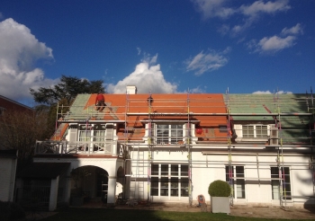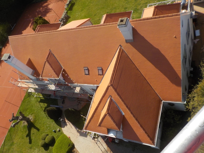 Renouvellement de toiture +- 350 m2 en tuiles plates de type Pottelberg 301 de teinte rouge.