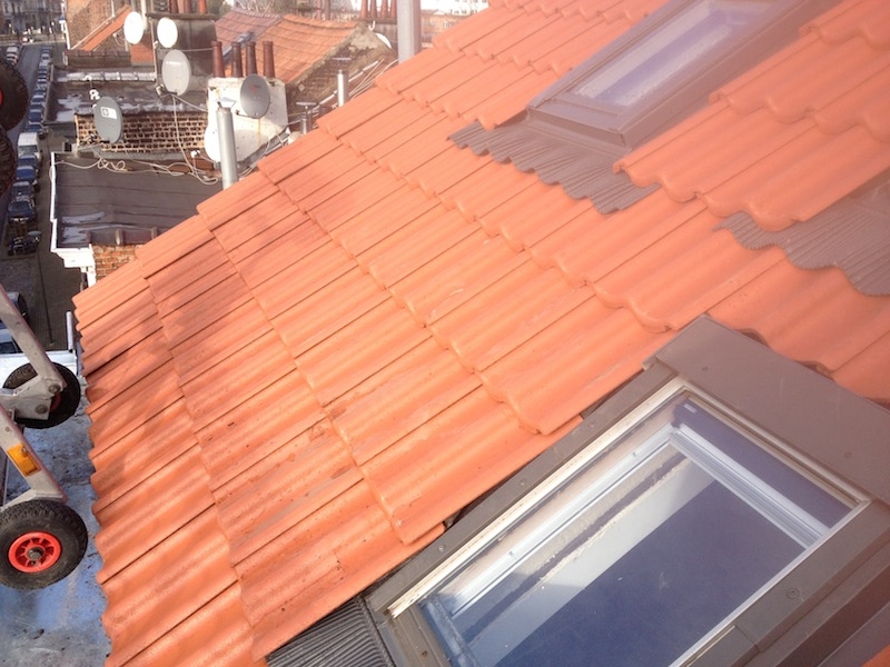 Réfection de la toiture de +- 63 m2 par la pose d'une isolation de type Bauder Pir 10 cm d'épaisseur et la pose de tuiles béton de type Sneldek de teinte rouge .